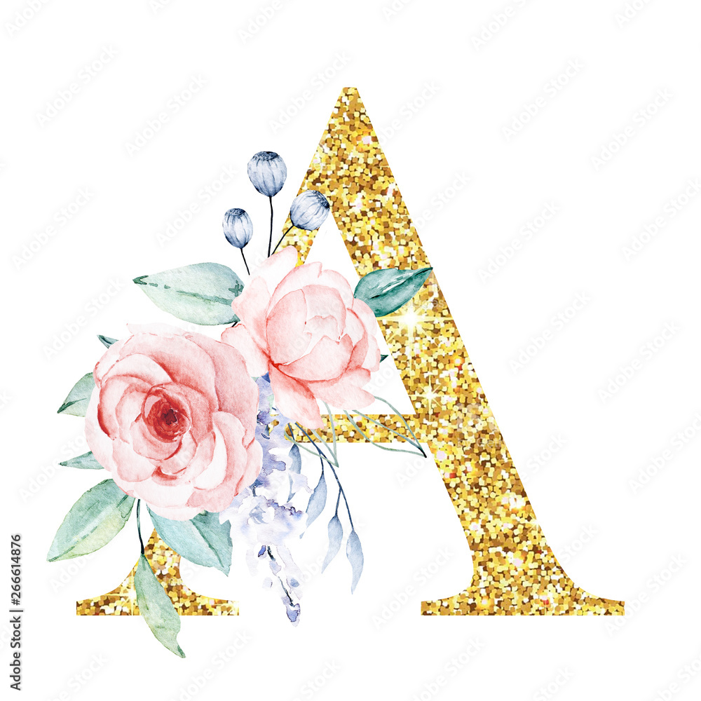 Floral Alphabet Letter A With Watercolor Flowers And Leaf Gold Glitter Monogram Initials Perfectly For Wedding Invitation Greeting Card Logo And Other Holiday Design Hand Drawn Stock Illustration Adobe Stock